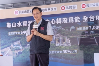 桃園市市長張善政致詞時提到,桃園是全國電力供應的核心,也是台灣環境面對淨零減碳的前線。龜山水資源回收中心營運超過30年,負責桃園近兩萬戶、每日約2萬3千噸的民生及事業廢水處理,是桃園第一座綠能水資源回收中心,同時也是目前規模最大、全國第一座「促進民間參與公共建設法」ROT方式推動,朝向轉廢為能轉型的綠能中心。每年發電量640萬度相當於超過15,600片400W太陽能板的年發電量(註2),可滿足約1,540戶家庭一年的用電量(註3),並可將廢水處理中的污泥從每年1,800噸,降減到每年1,000噸。此次龜山綠能水資源回收中心率全國ROT促參模式之先,提升全國整體再生能源使用量,後續將積極執行水足跡、碳足跡盤查,環境教育場所認證及TAF實驗室認證,改變水廠傳統營運的模式及效能。